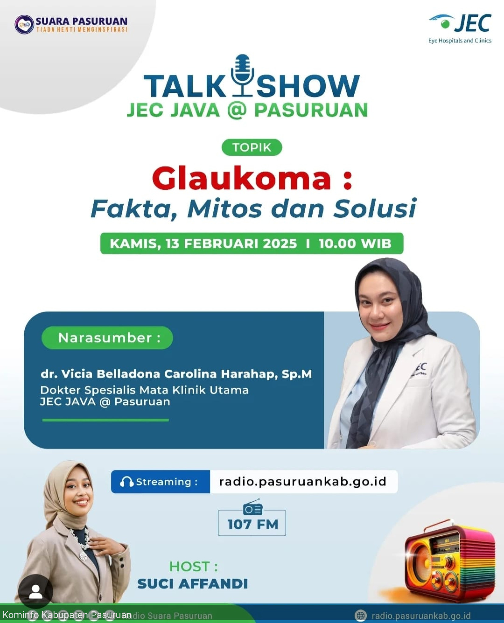 Dalam rangka meningkatkan kesadaran masyarakat tentang kesehatan mata, Radio Suara Pasuruan Dinas Komunikasi dan Informatika menggelar talkshow bersama JEC JAVA @ Pasuruan dengan topik "Glaukoma: Fakta, Mitos dan Solusi" pada Kamis (13/2/2025).